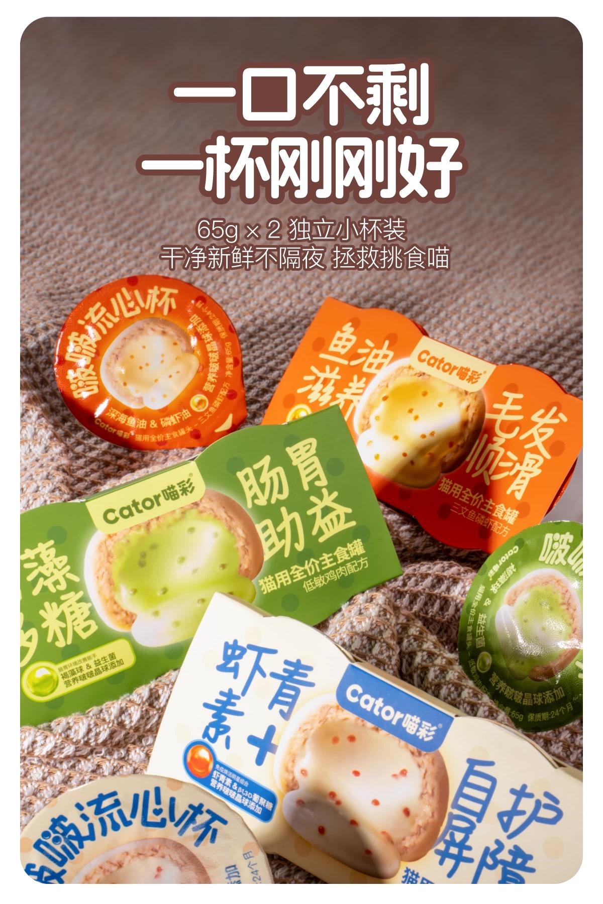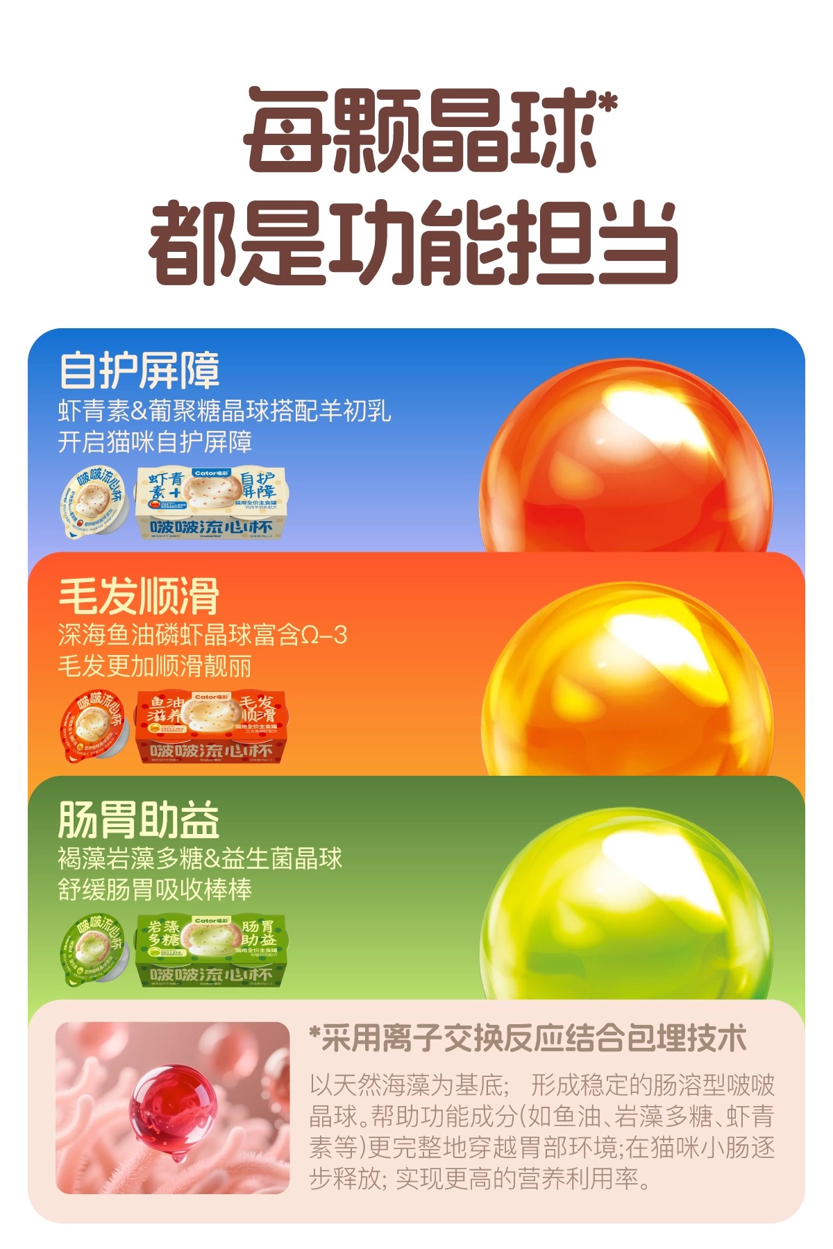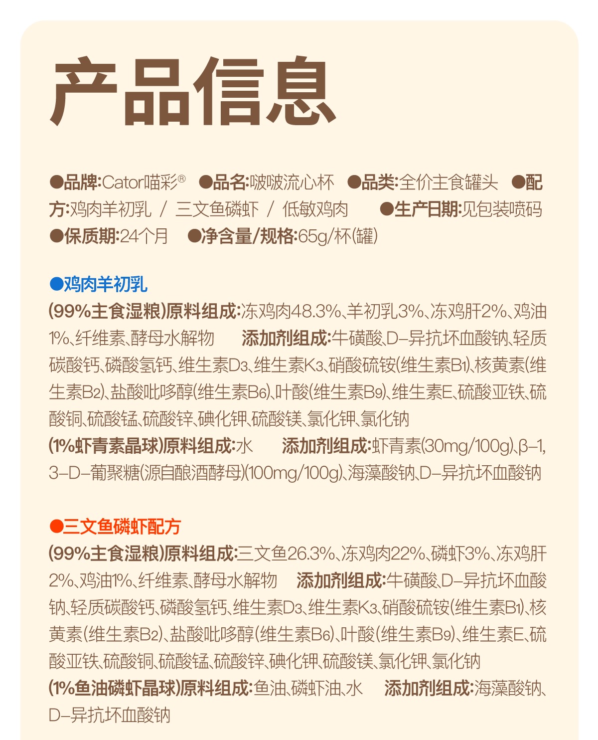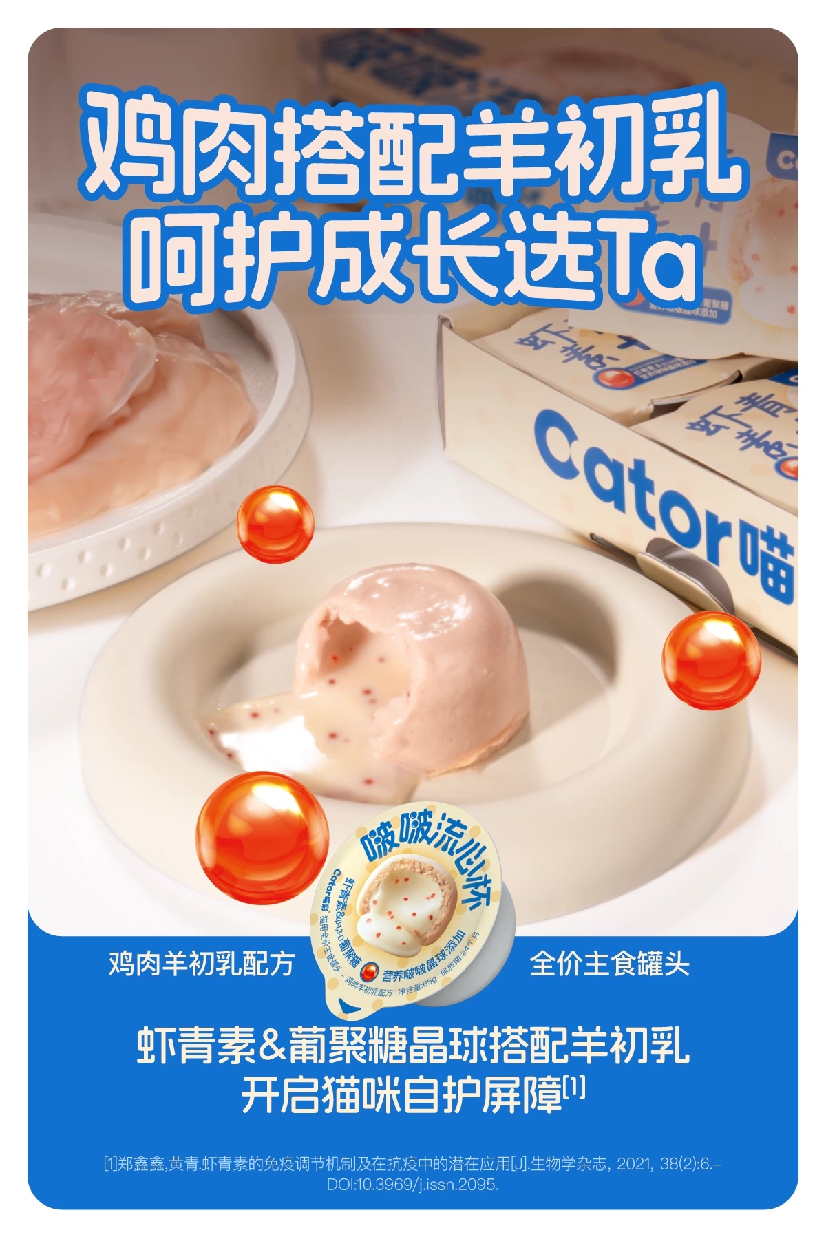 营养成分全部注入晶球中 肠道也能更好吸收 营养拉满一百分💯 健康小猫初养成,只此一枚流心杯~ 🍗低敏鸡肉口味 低敏鸡肉 ➕ 岩藻噗噗晶球 口口爆汁,鲜滑Q弹无负担🍽️ 人,咪再也不会软便拉稀啦~ 🍤三文鱼磷虾口味 深海三文鱼 ➕ 磷虾油噗噗晶球 新鲜三文鱼与磷虾完美融合,美毛的同时鲜美海味交织 铲屎官撸撸撸撸起来,滑滑滑滑出外太空了~ 鸡肉羊初乳配方 精选牧场羊初乳 ➕ 虾青素噗噗晶球 嫩滑鸡肉与浓稠羊初乳黄金搭配,绵密细腻口感🥛 直接吃出一个身体强壮的健康猫猫~ 一口下去全是肉 满满流心,肉肉爆汁,搭配上爆珠~ 那感觉~ 简直就是猫界小泡芙啊~