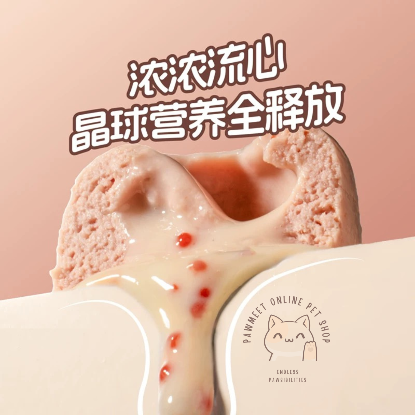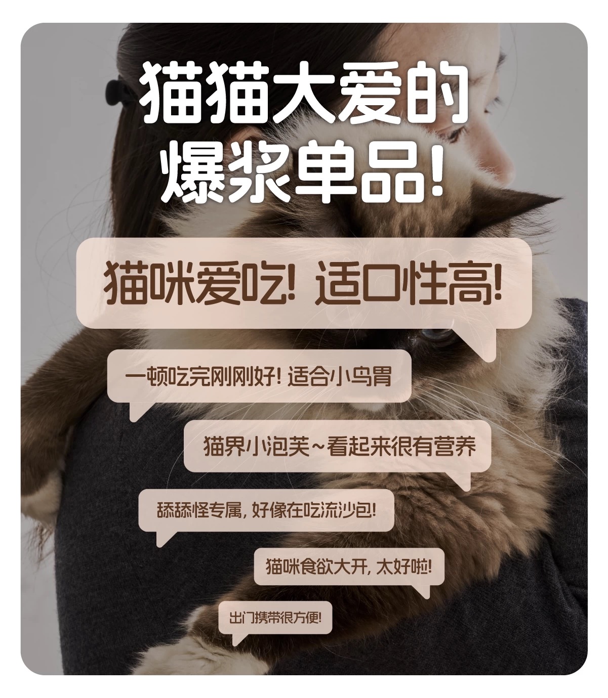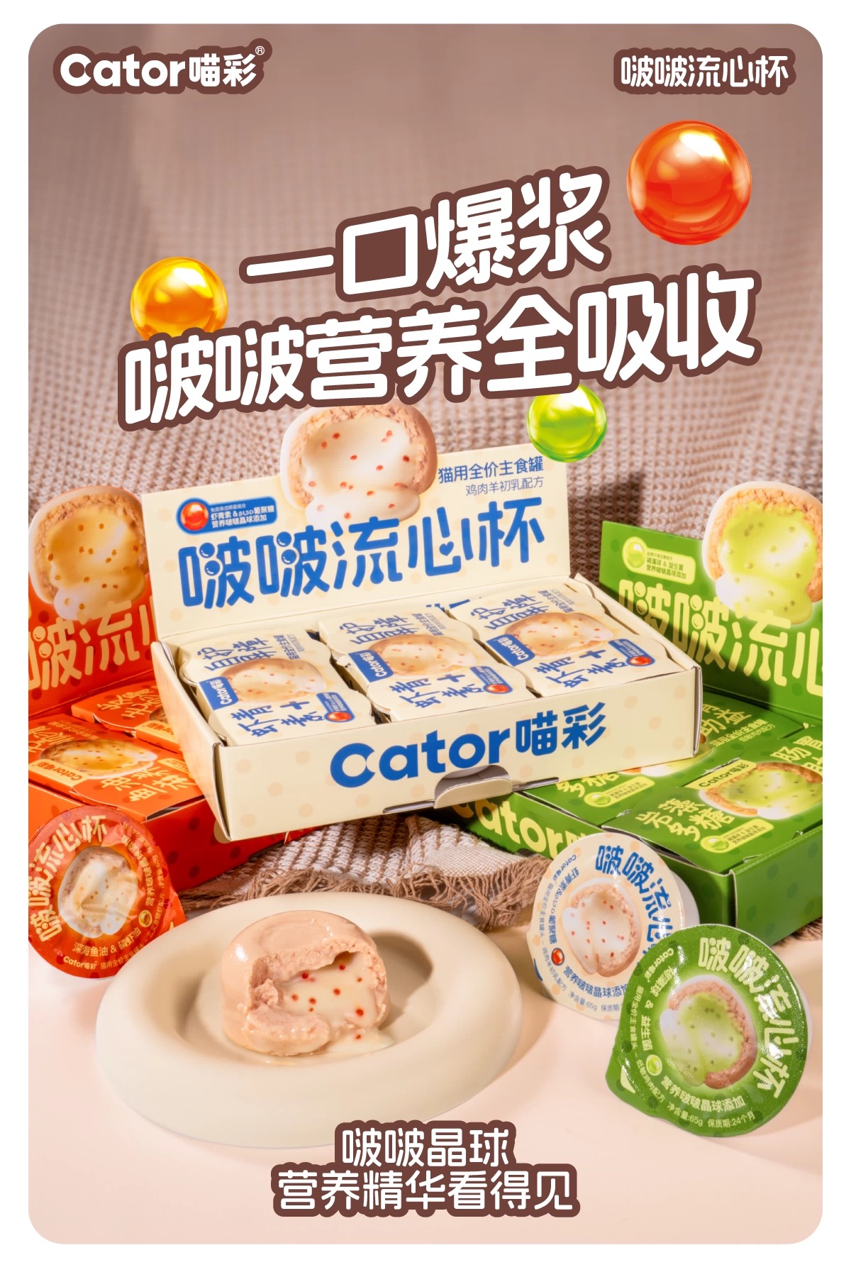 营养成分全部注入晶球中 肠道也能更好吸收 营养拉满一百分💯 健康小猫初养成,只此一枚流心杯~ 🍗低敏鸡肉口味 低敏鸡肉 ➕ 岩藻噗噗晶球 口口爆汁,鲜滑Q弹无负担🍽️ 人,咪再也不会软便拉稀啦~ 🍤三文鱼磷虾口味 深海三文鱼 ➕ 磷虾油噗噗晶球 新鲜三文鱼与磷虾完美融合,美毛的同时鲜美海味交织 铲屎官撸撸撸撸起来,滑滑滑滑出外太空了~ 鸡肉羊初乳配方 精选牧场羊初乳 ➕ 虾青素噗噗晶球 嫩滑鸡肉与浓稠羊初乳黄金搭配,绵密细腻口感🥛 直接吃出一个身体强壮的健康猫猫~ 一口下去全是肉 满满流心,肉肉爆汁,搭配上爆珠~ 那感觉~ 简直就是猫界小泡芙啊~